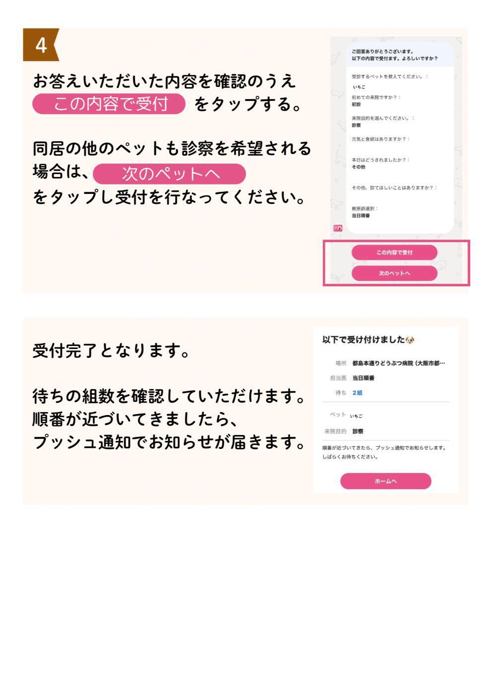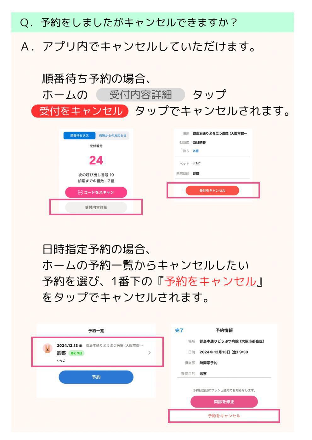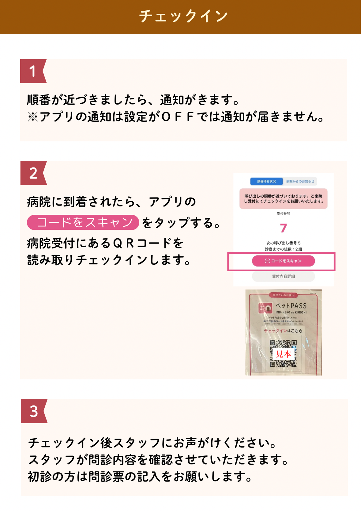 ※通知後、長時間ご来院の確認が取れない場合はキャンセルとさせていただきます。その際もプッシュ通知にてキャンセルの通知を送らせていただきます。