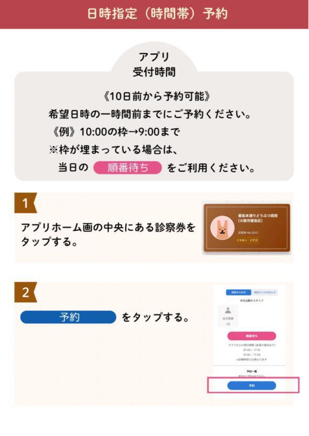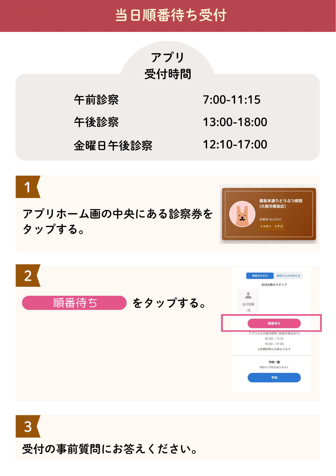 ※順番予約後、プッシュ通知による呼び出しが来ていなくても、最終受付時間(午前11:45、午後18:45、金曜午後17:45)までにはご来院をお願いします。